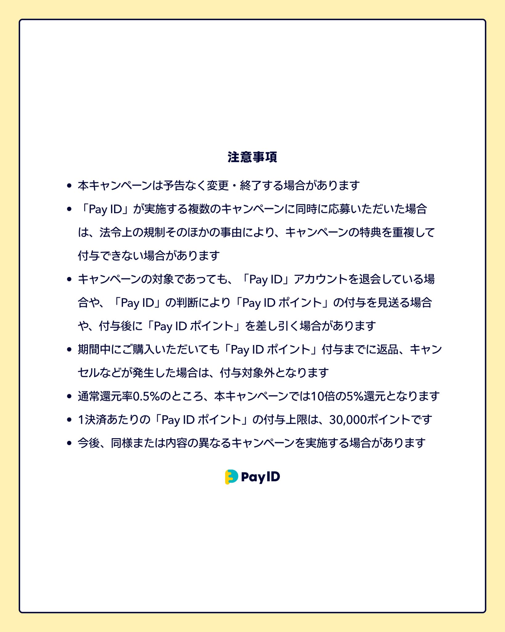 「Pay ID」が実施する複数のキャンペーンに同時に応募いただいた場合 は、法令上の規制そのほかの事由により、キャンペーンの特典を重複して 付与できない場合があります。