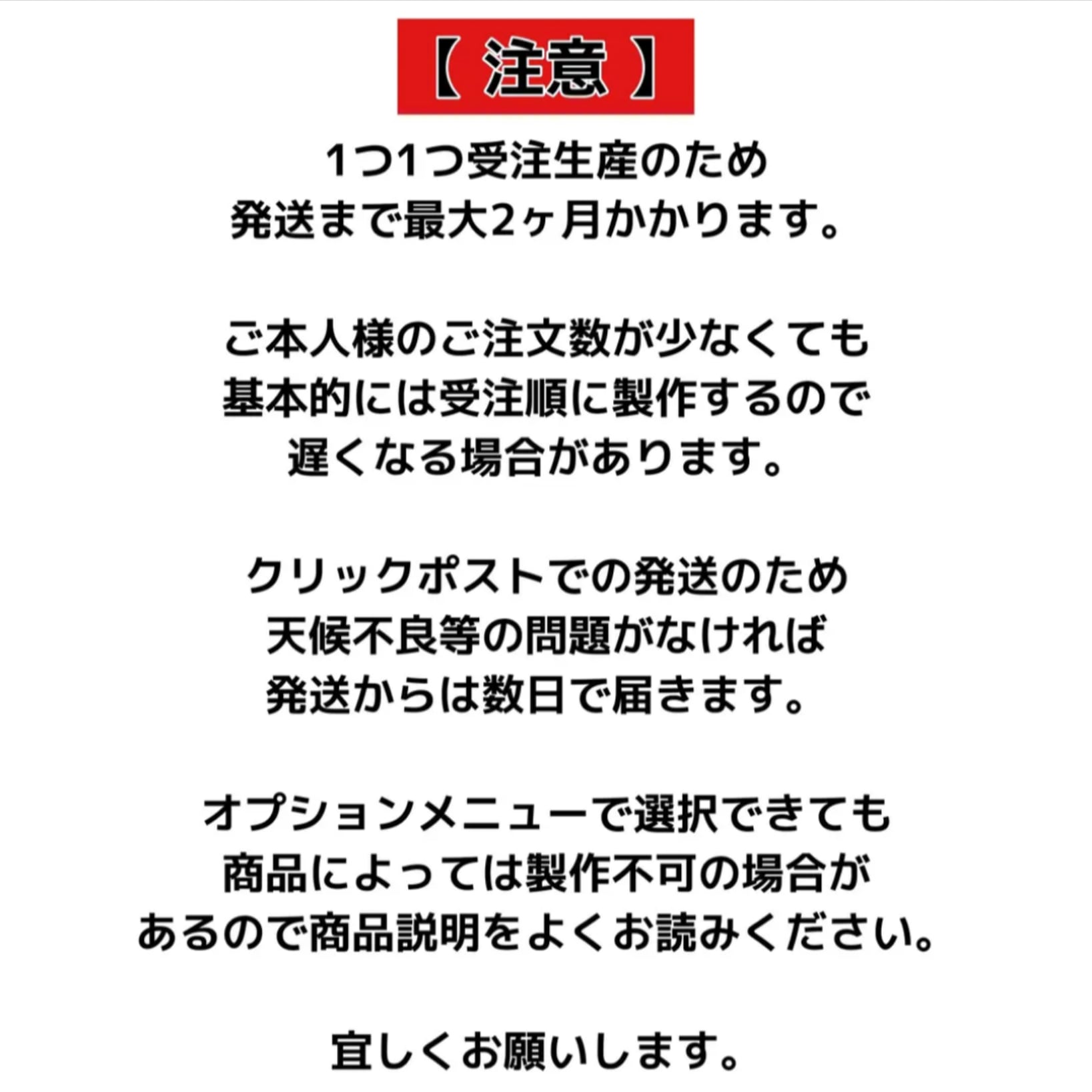 ◆当店は受注生産のため、在庫ありになっていてもすぐに発送できない場合が多いです。混み具合によりますが、ご注文から2日〜2ヶ月で発送目安になります。